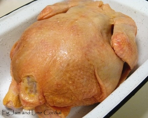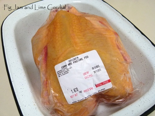 ED’s post sent me to Beth’s website, where I was happy to discover that her products are available in the Inner West. A visit to George at Dulwich Hill Gourmet Meats netted us a magnificent organic and free range 1.9kg bird. The first thing I noticed was the colour – Beth’s chooks are both pasture and corn fed, resulting in a rosy bird tinged with gold. Quite different to the white free range chickens we normally buy…