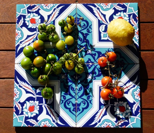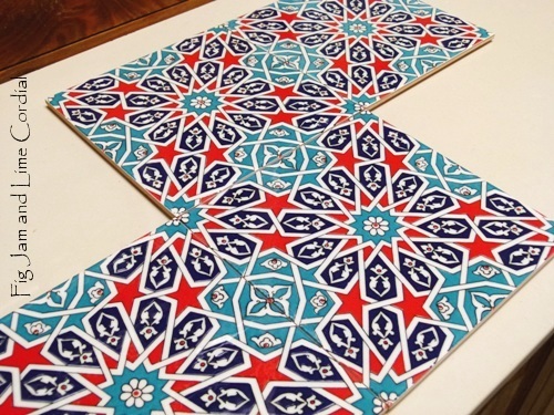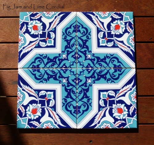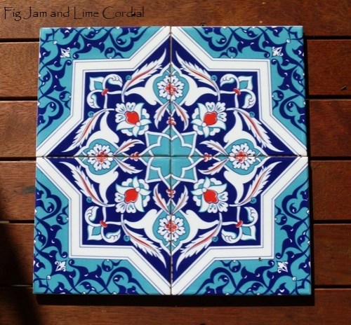 On my recent visit to Turkuaz Motif, I picked up some Turkish ceramic tiles to experiment with. They were just $8 each on special, and I thought that they’d make wonderful trivets to replace our worn and grotty bamboo ones…