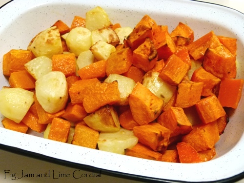 On a whim, I peeled and diced them all (we had half a butternut pumpkin, a large sweet potato, a handful of small Desiree potatoes, and a large swede), then tossed them in a little oil and salt and baked them in a 200C oven until tender.