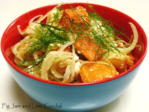 Some of the pumpkin, potato and sweet potato were combined with half a thinly sliced fennel bulb (the last one from our garden for this season) and some of our home marinated feta, before being simply dressed in a little extra virgin olive oil and white balsamic vinegar…