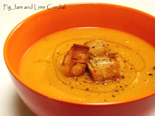 Inspired by my friend Em’s recent post, I turned the remainder into a thick soup. After frying a chopped onion in a little oil, I added the roasted vegetables and a container of frozen chicken stock (homemade), and brought the pot to a boil. An immersion blender smoothed it all to a creamy consistency, and we served it with lemon oil infused sourdough croutons…