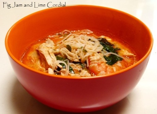 Inspired by my faux laksa success, I made this simple soup for lunch using freezer leftovers from Christmas (prawns, prawn stock, poached chicken), basil and purslane from the garden…