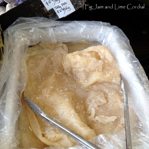 Salted jellyfish is (I think) soaked and then sliced up and served cold. It’s an acquired taste, but I love it. I’ve never seen it in its raw state before though – it reminded me of bacalhau…