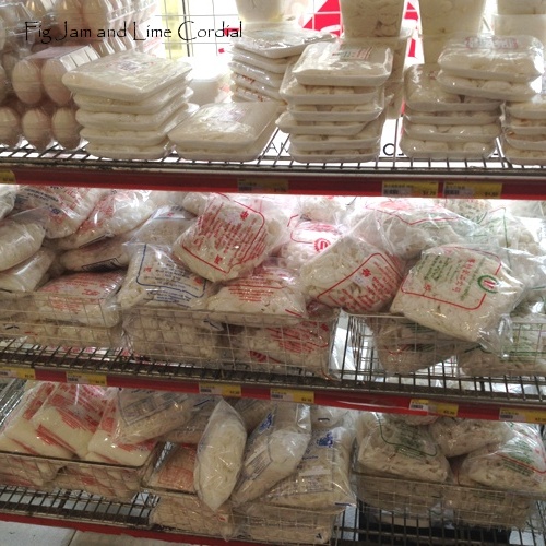 Locally made rice noodles sit unrefrigerated by the door. They must turn over very quickly, because all the packets had long expiry dates on them…