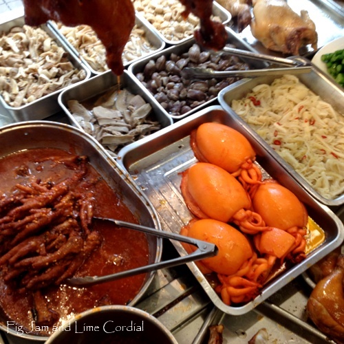Squid, chickens’ feet, giblets and all sort of other (ahem) treats are laid out behind the counter…