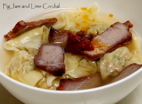 Later that day, I needed a late lunch. I took a container of treasured Burrawong Gaian chicken stock and a handful of homemade wontons out of the freezer. The stock was defrosted in a small pan, while the wontons were boiled for ten minutes in a separate saucepan of water. Once cooked, the dumplings were added to the stock along with the sliced char siu, and lunch was ready.