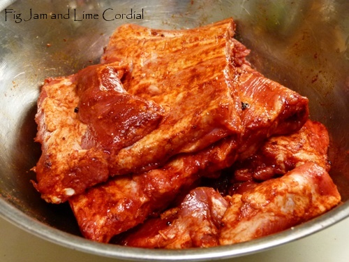 I began by rubbing two large racks of what we call American spare ribs (I think these are known as baby back ribs in the US) with two tablespoons of brown sugar and a tablespoon each of paprika and sea salt…