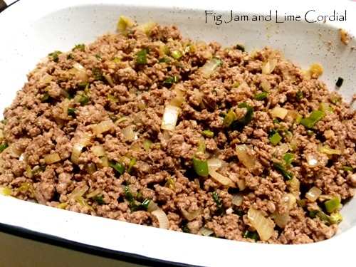 2. Make the filling next – heat the oil and butter in large frying pan and fry the onions and spring onions until soft. Add the beef and stir to break it up and brown it a little, then add the chilli powder, paprika, cinnamon, cloves, sugar, salt and water. Cook over a low heat until the liquid and fat have separated from the meat. Check for seasoning and adjust as required.