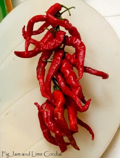 …are cayenne chillies from the garden, strung together on a thread. These thin-skinned chillies seem to dry well without going mouldy…
