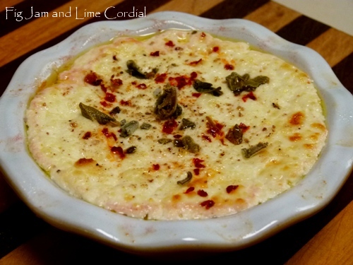 We also had leftover ricotta from lunch – on Wednesday, it was drained, then spooned into a small pie dish, sprinkled with crumbled dried sage, black pepper and our homemade chilli flakes, and baked until firm (I popped it into the oven while the pulled pork was on – see below).