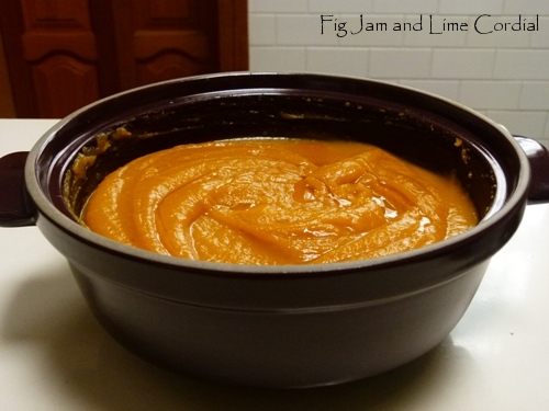 On Saturday, I combined the leftover third of the roasted monster squash (the top section, which was free of rice and meat) with the baked butternut from a few days before, added in a box of the frozen defatted stock from the pulled pork…and made soup!