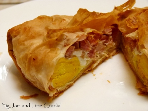 Barb, this one is MUCH easier, as I didn’t have to make the fiddly shortcrust pastry from scratch. The savoury pie was easy – I had a stack of buttered fillo, cut into large squares. I scattered over ham, dusted with a little ground pepper, and then cracked a raw egg into the middle. Then it was a case of folding the pastry sides up while chasing the raw egg around to make sure it was all encased and then baking! :)