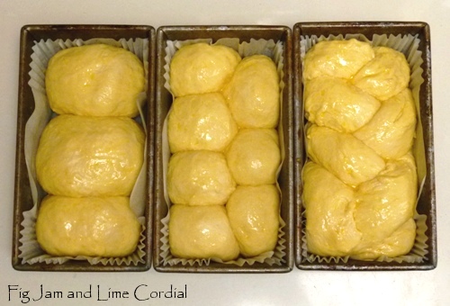 6. Turn the dough onto a lightly floured surface and using your dough scraper, give it a couple of gentle folds. It’s now ready for whatever your imagination has in mind for it. I turned this batch into faux brioche by dividing it into three and then placing the shaped loaves into lined (and greased) tins to prove.