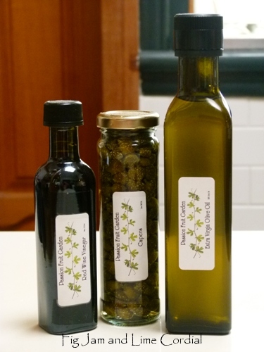 …are treasures from Glenda and Maus’ Passion Fruit Garden kitchen – homemade red wine vinegar, homegrown pickled capers, and extra virgin olive oil from their trees. They were over for a visit from Perth, and Glenda carefully packed these goodies in her luggage for me…