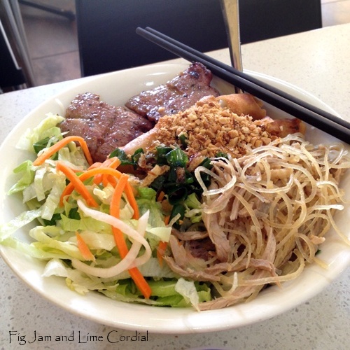 …noodle salad with spring rolls and pork ($9)…