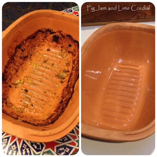 Finally, I know I’m meant to ease off on the Römertopf evangelism, but I had to show you these before and after photos. The photo on the left is how the pot went into the dishwasher after roasting chicken, potatoes and stuffing. The photo on the right is how it came out the following morning (that’s all I’m going to say)…
