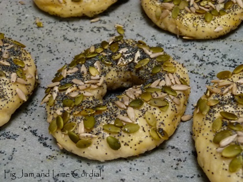 These were so delicious that we ate them without any filling. The seed topping is quite fragile though – handle with care, or you’ll end up with a denuded bagel. We’ll definitely be making them again!