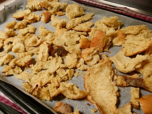 A few days later, I cut the crust off a sesame loaf (the tribe had spoken, and these loaves had been ignored by everyone except me). I sliced it up thinly and baked the pieces in the oven, again at 100C (no fan) for a couple of hours. I also tore apart half of another loaf and baked it on the lower shelf…