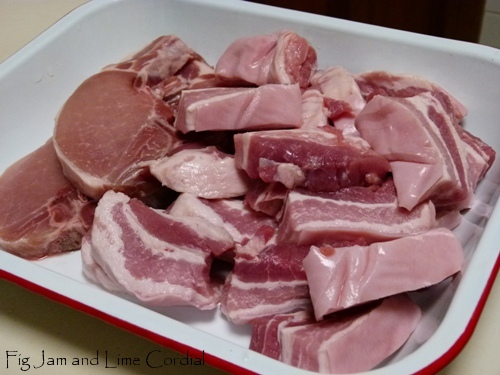 From the freezer, I excavated a slab of belly pork and four thin pork chops. Once the meat had defrosted, I put the Römertopf lid and base in a sink of cold water while I prepared the ingredients (the pot needs about 20 minutes soaking time).