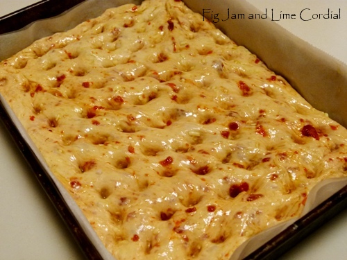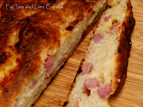 On Saturday morning, I added a handful of chopped jamon to our yeasted dough, along with Ford Farm Coastal cheddar and dollops of Pete’s quince paste. The risen dough was then shaped into two focaccias…