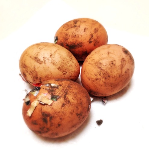 It’s been raining so much that our muddy backyard eggs look like potatoes!