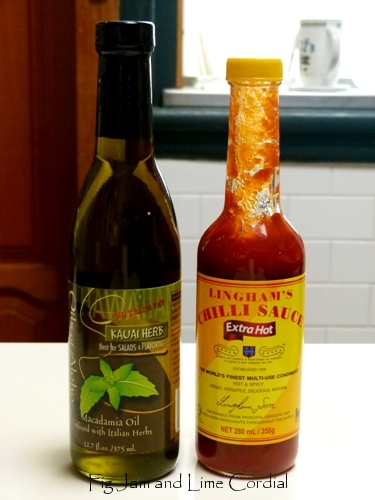 …is a bottle of flavoured macadamia oil from Hawaii (thanks Lorraine!) and a bottle of Lingham’s Extra Hot chilli sauce. When Malaysians say “extra hot”, they’re not kidding…