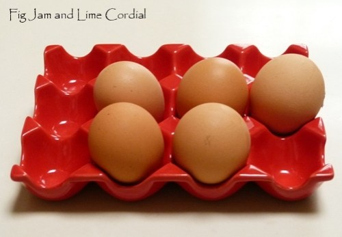 …is a new egg holder. Inspired by Moya’s post last month, I bought this little red ceramic tray to hold the eggs needed for baking – it stops them rolling all over the bench…