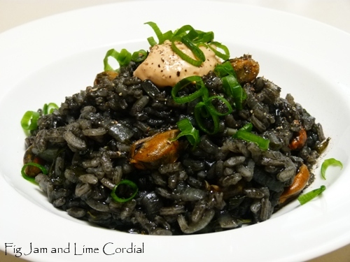 Looks delicious, a squid ink risotto with a hand ful of mssels- briny heaven.