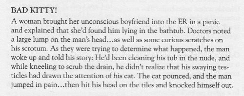 Hahaha…I can just imagine with three boys at home. “Now listen, don’t ever wave your testicles in front of the cat, sons, or anything might happen..” :D
