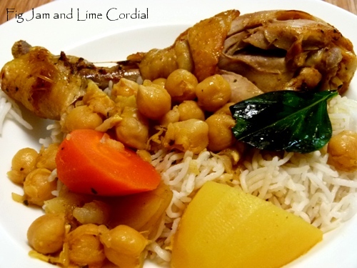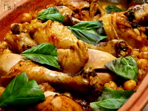 By that stage the chicken had been in the oven for an hour, and I suddenly remembered that I’d forgotten the chick peas. I pulled the pot out and added them in, squidging them into the cooking liquid as much as I could. (Remember to never put the hot pot on a cold surface, or it could crack.)