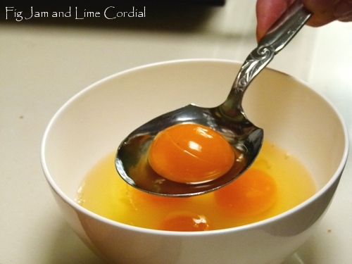 Carefully crack the eggs into a bowl, then scoop out a yolk with a little bit of white (my pedantic husband insists that a bit of white is nicer than all yolk, but that a whole egg is too much)…