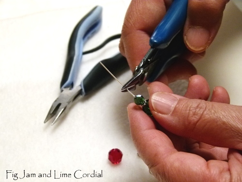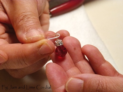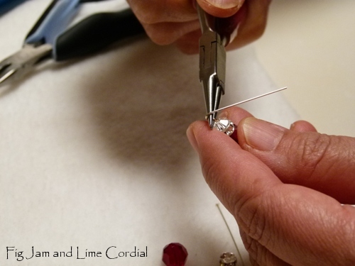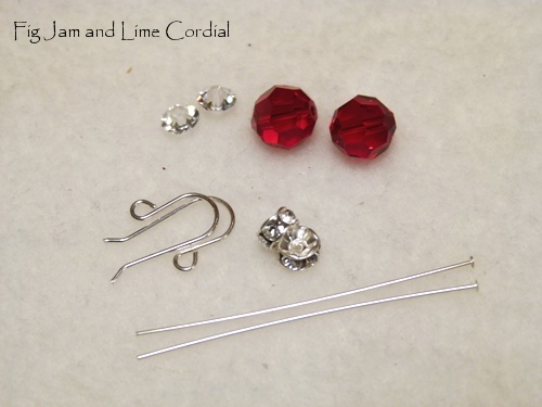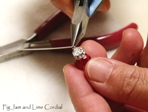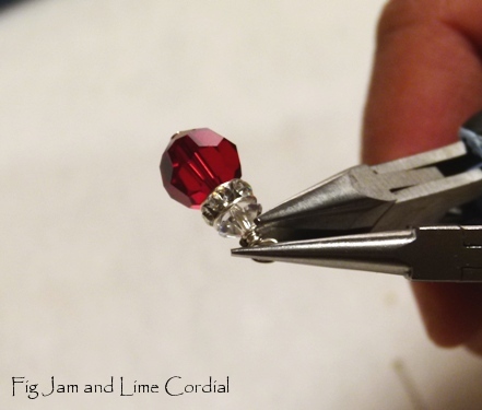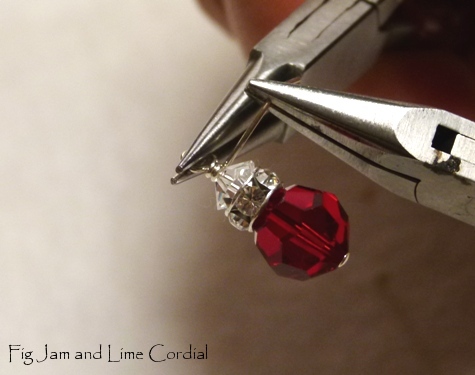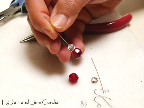 I like to use 10mm Swarovski crystals for earrings – the red ones below are a colour called Siam. I’ve also used 6mm silver rondelles, 22 gauge sterling silver head pins, sterling silver earring hooks, and a small spacer crystal (Swarovski 5305 in 6mm clear).