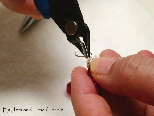 Holding the loop in the round nosed pliers, carefully and gently tuck the end of the wire in with the flat nosed pliers…