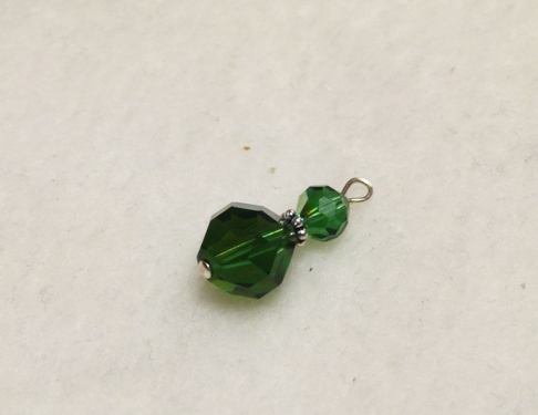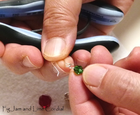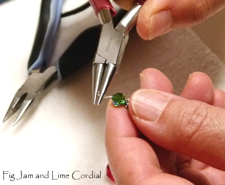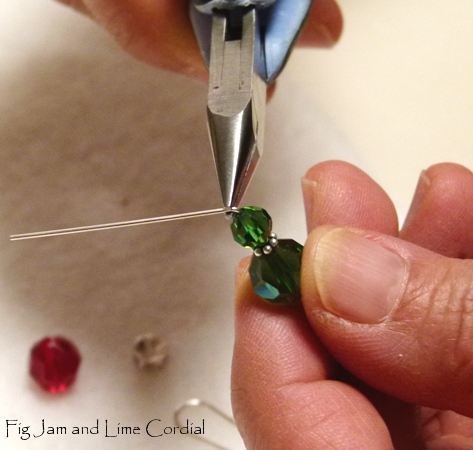 If all the wire wrapping sounds a bit ominous, here’s a much easier method. Thread the beads onto the head pin – this time I used vintage Swarovski green tourmaline in 10mm and 6mm, with a small sterling silver spacer between them…