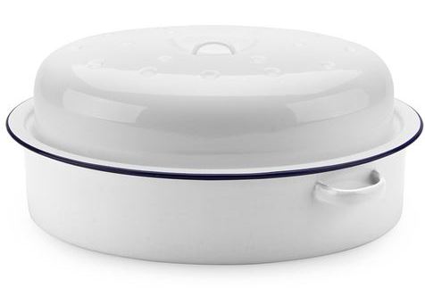 After some discussion on Christmas morning about the best cooking method (it didn’t fit in the Römertopf and by that time it was too late to buy oven bags), we decided to use our large 36cm Falcon enamel roaster (photo below is from the Peters website – my pot is now seriously grotty). The goose fit in perfectly…
