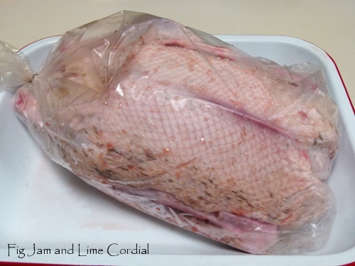Apparently the secret is to roast a young goose. And our little bird at barely 3kg was certainly that. It had arrived frozen and spent three days defrosting in the fridge.