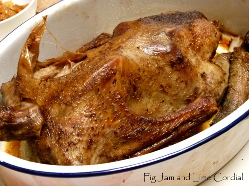 I cooked goose last year by cutting off the legs and slow cooking them, and roasting the crown (breast on the bone) a little faster than usual. This meant both types of meat were cooked to perfection. It was a Raymond Blanc recipe, but I couldn’t see it online anywhere this Christmas. Your young goose looks pretty good too! I’ve only just finished the goose fat from Christmas 2013, there was so much of it!