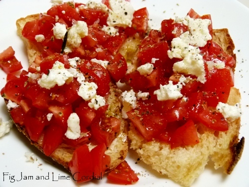 …then topped with the tomatoes, a sprinkling of salt and pepper, a little dried oregano and small chunks of feta. A good drizzle of more extra virgin olive oil finished it off…