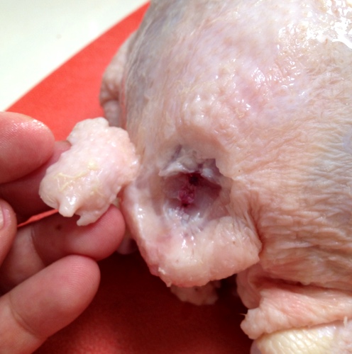 It’s located on the “bishop’s nose”, and it’s the gland that secretes oil which the bird uses to waterproof its feathers. I trim it off and discard it…