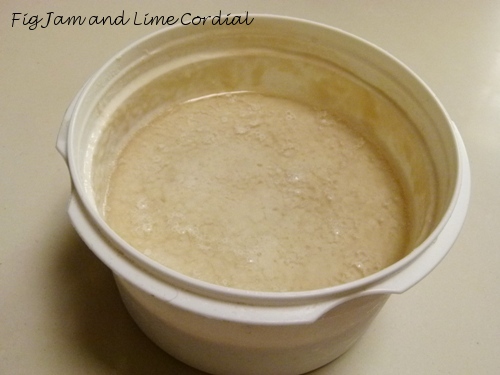 I’ve since learnt that this is false economy. When the amount of starter in the fridge gets too large, the small weekly feeds aren’t enough to keep it going, and the starter can stagnate and start to die off. So these days I keep no more than 1 – 1½ cups of starter in the fridge at any given time. Here is a photo of my fridge starter, just after feeding and before going back into fridge…
