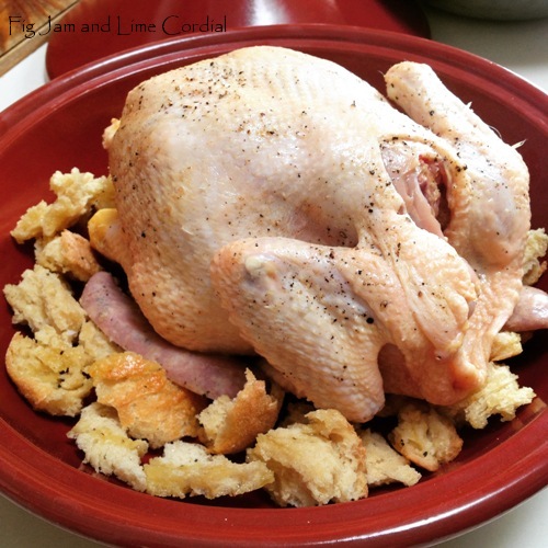 I drizzled a little olive oil over the dried croutons and scattered them, with the remaining chorizos, over the base of my large Emile Henry tagine. The chook was rubbed with oil, salt and pepper, stuffed, then perched breast-down on top of the bread…