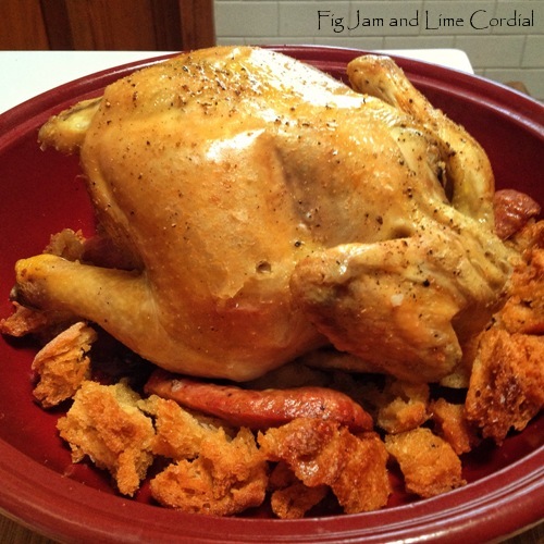 Gillian, I prefer the Romy, but I didn’t want the bread to go soggy this time and the Romy puts a lot of water into the dish. Whenever we roast in the Romertopf, I take the lid off for the last half hour to let it brown up. It makes for a very moist bird!