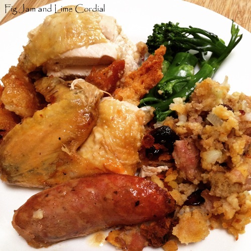 Beth’s bird was only 1.34kg, but it was full of flavour. We had a few chicken chorizos leftover from the previous night, so I squeezed a couple out of their casings and made a cornbread, chorizo and cranberry stuffing.