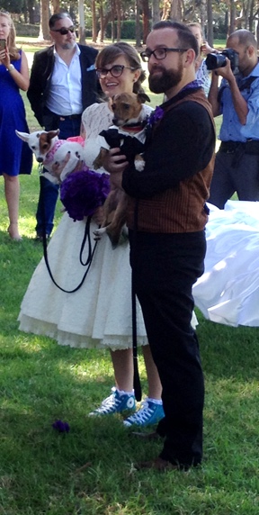 The bride wore a short vintage lace dress and blue Converse shoes which let her dance the night away. Instead of a bridesmaid and a best man, they had a bride-dog and a best-dog (both of whom served as ring bearers) and their wedding vows were taken from Rick Astley’s Never Gonna Give You Up…