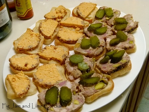 At one of our dinners, I served up a 70s style fondue cheese log and a rabbit and quail terrine on homemade melba toasts. Recipes for both the cheese and bread to follow in later posts…