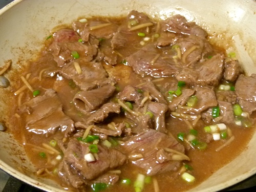 4. A few minutes before the rice is cooked, stir two teaspoons of oil into the beef mixture. Heat up a frying pan and add a tablespoon of oil. Add the beef carefully, spreading it out into a single layer as much as possible. Allow to sit for a minute, then stir fry for an additional 30 seconds until the beef is brown, but still a bit rare. Stir in the oyster sauce and chopped spring onions…