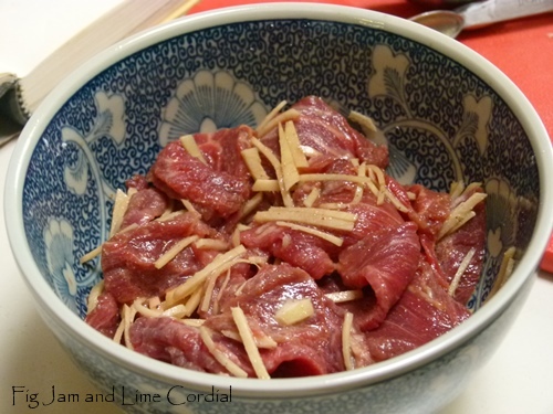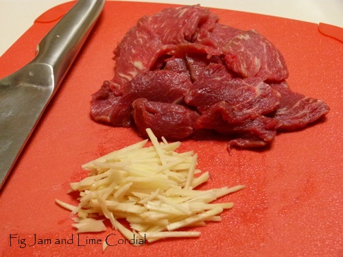 2. Slice the beef finely, making sure to cut against the grain for maximum tenderness. Peel and finely julienne the ginger (I like to add quite a lot)…