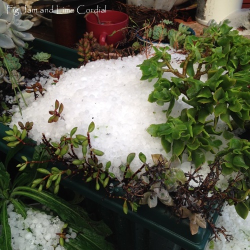 As my old dad would have said “Blow me down!” that doesn’t look like hail, it looks like snow Ms Celia! I think you nailed it. We do, indeed, live in “interesting times”. We could all sit around wailing with sackcloth on our heads or we can learn to take pleasure in small delights like knowing that our kids are on the right rails, having someone who you love’s hand to hold and knowing that we have everything that we need, right here, right now and knowing that that is “enough” :)