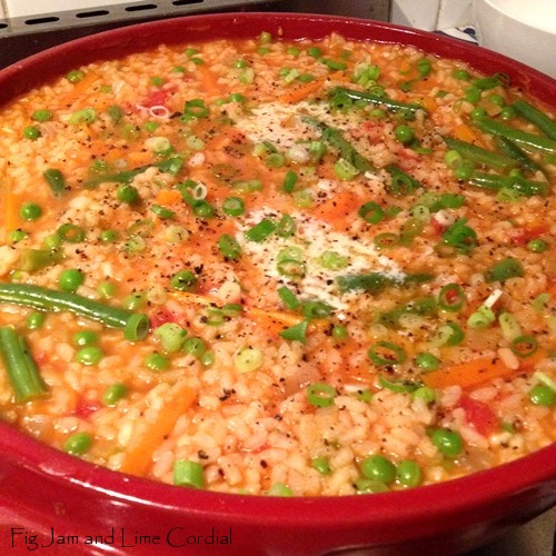 On ANZAC Day, after clambering onto the kitchen roof to scrape off hail and positioning buckets under the skylight and hairdryering the bed, we needed a simple dinner. God bless Tanya and her easy Spanish recipes – chorizo tapas and vegetarian arroz caldoso, accompanied by garlic and cheese bread – were quick to make and perfect comfort food for a cold, wet evening…