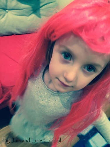 Fulfilling a promise I’d made the week before, I bought Grace a $10 pink wig. She refers to it as her mermaid hair. If you ever need to buy a hairpiece, I ordered this one online from The Wig Outlet and found them most efficient to deal with…